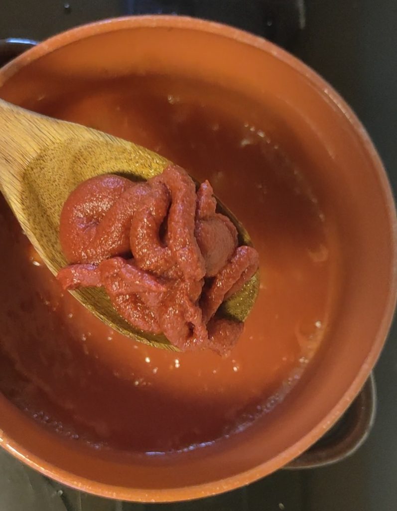 Ik ben een fan van tomatenpuree en doe er een of twee eetlepels van in om de smaak van de saus te versterken. (optionele stap.)