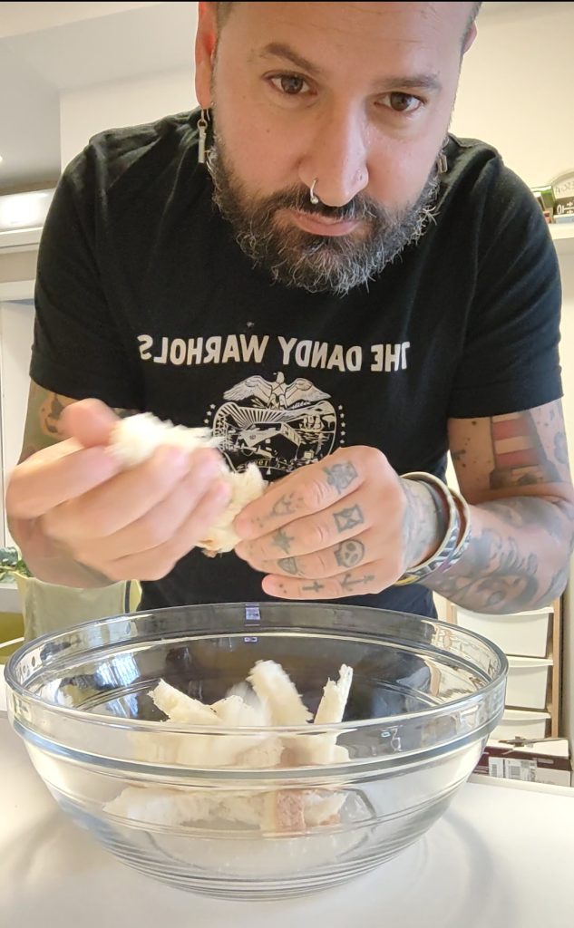 Om te beginnen moeten we het brood weken en daarvoor gebruiken we niet water zoals we gewend zijn, maar we gebruiken droge witte wijn om meer smaak aan de gehaktballen te geven en de smaak te versterken.