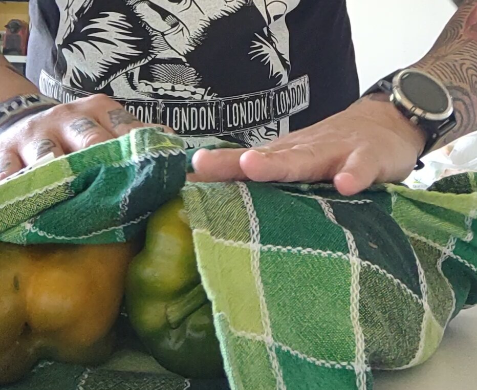 Na 30 minuten koken haal ik de paprika’s uit de magnetron en draai ze met de juiste voorzorgsmaatregelen om verbranding te voorkomen naar de andere kant.