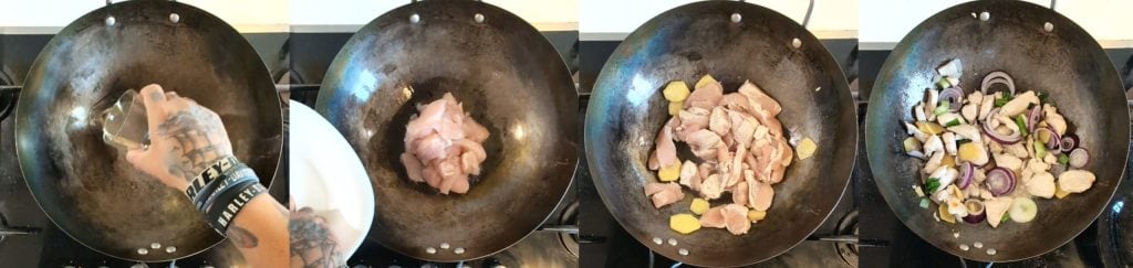 Vervolgens bereid ik de kip voor: ik snijd het in reepjes en bak het in een antiaanbakpan met 2 eetlepels extra vierge olijfolie. Zodra het aan alle kanten goudbruin is, voeg ik de gember in dunne plakjes toe en ga door met koken totdat de kip goed gebruind is. Op dit punt voeg ik de ui en lente-ui toe en ga verder met de bereiding van mijn gesmoorde noedels.