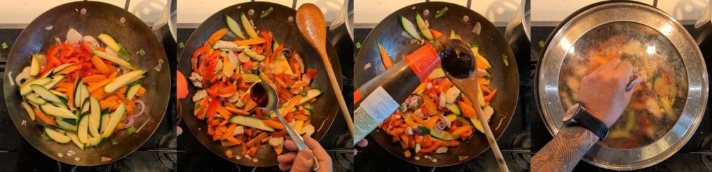 Op dit punt voeg je alle andere groenten toe, laat ze een paar minuten stoven samen met de kip, de ui en de gember en voeg onmiddellijk de sojasaus en de oestersaus toe. Maak je geen zorgen als je geen oestersaus hebt, want je kunt meer sojasaus toevoegen, lepel voor lepel, totdat je de juiste hartigheid hebt gevonden. Dek alles af met een deksel en kook op laag vuur gedurende ongeveer tien minuten. Maak je geen zorgen over het koken, want de groenten zullen koken met de stoom van het water dat ze in de pan zullen afgeven.
