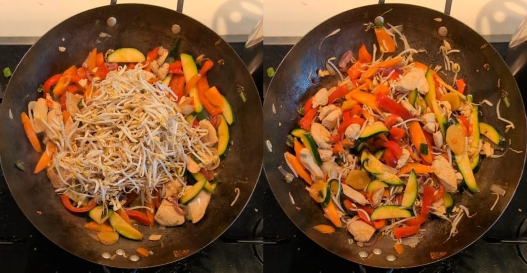 Kook de groenten apart van de kip of tofu om te voorkomen dat ze uit elkaar vallen. Voeg ze pas op het einde van het koken samen. Verhit de pan goed voor je de olie toevoegt voor een krokantere bereiding van de groenten. Kook de noedels niet te lang om te voorkomen dat ze papperig worden.