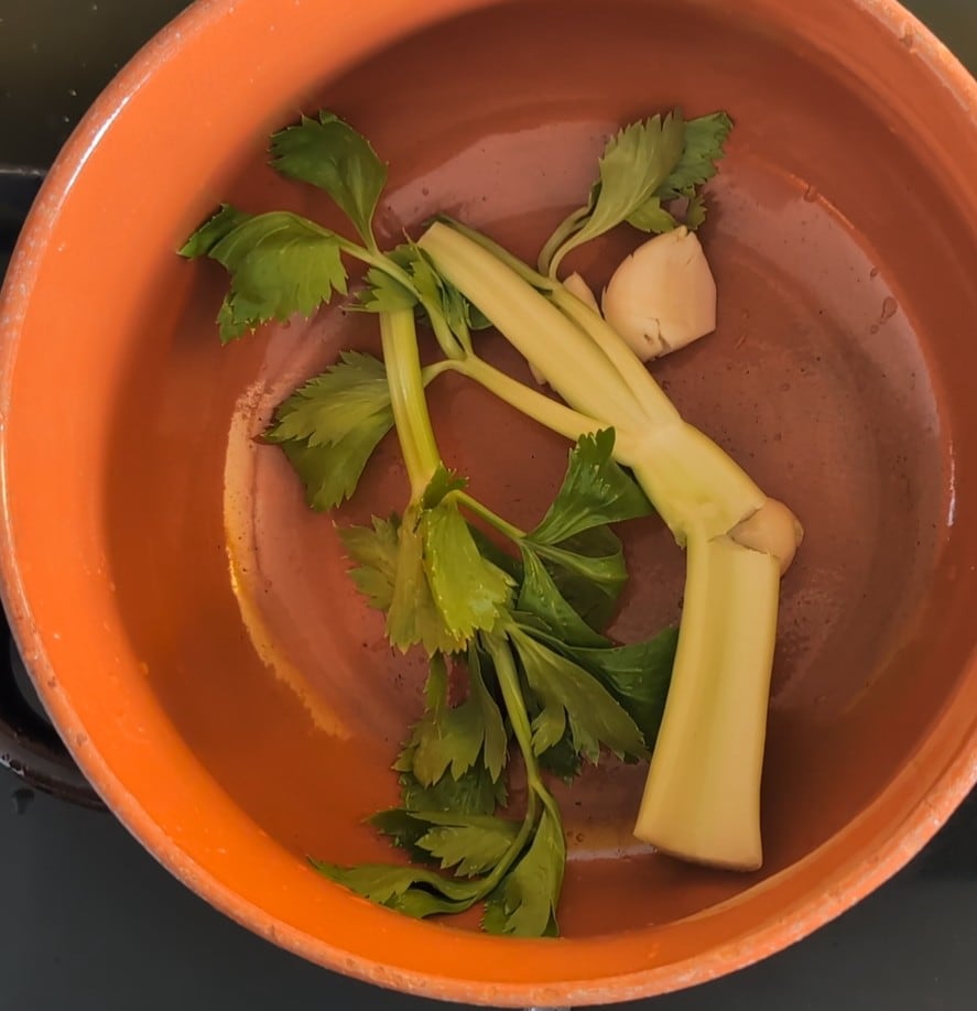 Vervolgens in de aarden pot of een andere die hoog genoeg is om alle kikkererwten ruim te bevatten, doen we twee teentjes knoflook, een of twee hele selderijstengels, de kikkererwten en vullen met koud water tot 3 vingers boven deze fantastische peulvruchten.