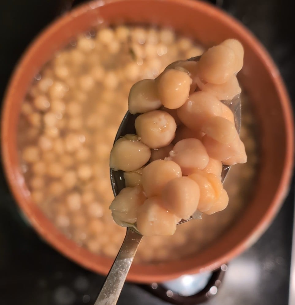 De volgende dag, wanneer het tijd is om de kikkererwten te koken, gooi je het weekwater weg en was je de kikkererwten grondig, kijkend en weggooiend indien nodig degenen met onvolkomenheden of onzuiverheden voordat je ze natuurlijk kookt in een pot, bij voorkeur aardewerk.