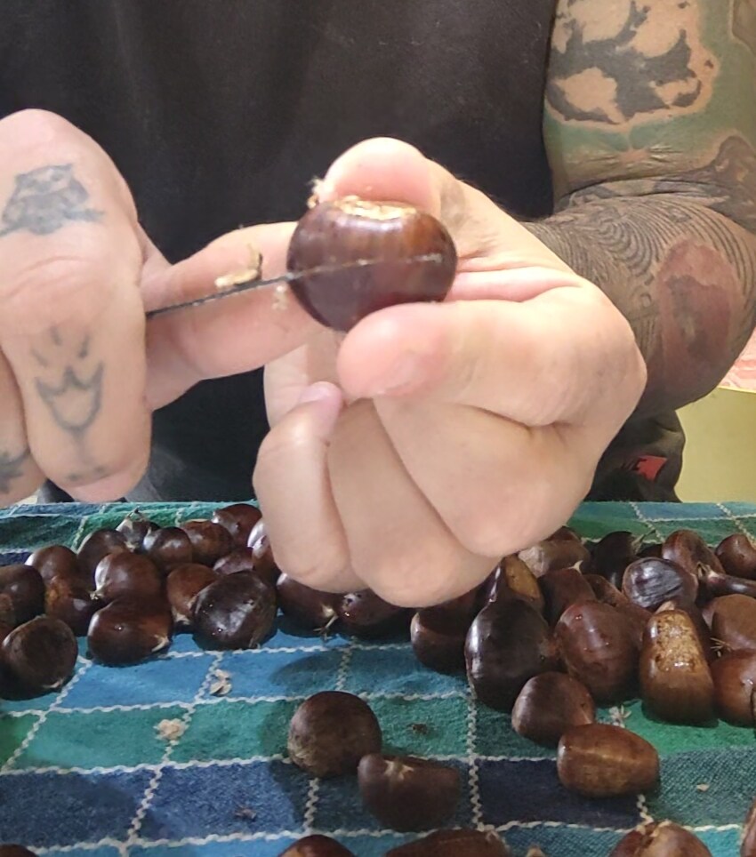 Na het wassen en drogen moeten ze aan één kant worden ingesneden om te voorkomen dat ze tijdens het koken opzwellen en ontploffen, wat niet alleen overdreven rommel kan veroorzaken maar ons ook pijn kan doen. Deze stap moet worden gevolgd, ongeacht de methode die we gebruiken om gepofte kastanjes te maken.