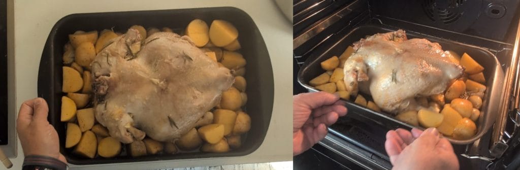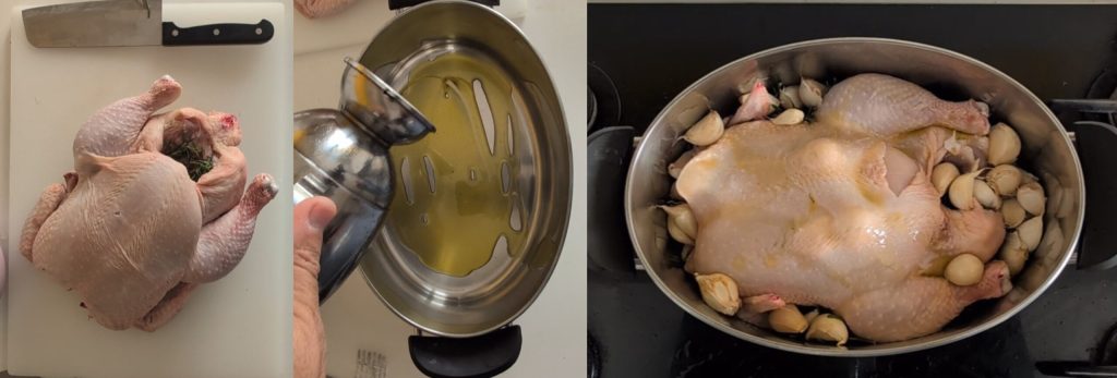 Nu is het de beurt aan de kip. Nadat we hem met keukenpapier hebben drooggedep, vullen we hem met een paar takjes rozemarijn en een paar tenen knoflook in de buikholte. Als we de smaak verder willen versterken, kunnen we een paar tenen knoflook onder de huid van de kippenborst steken. Nadat we de kip goed hebben gevuld, bestrijken we hem met extra vierge olijfolie en laten we hem aan beide zijden bruin worden in een braadpan (in dit geval ovaal) samen met de resterende 32 tenen knoflook (40 in totaal – 8 reeds gebruikt) en extra rozemarijn.
