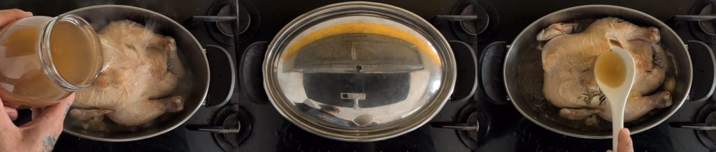 Op dit punt voegen we de hete bouillon toe totdat de kip ongeveer halverwege ondergedompeld is in de braadpan. We dekken af met het deksel en laten het 30-40 minuten sudderen op laag vuur. Tijdens het koken bedruipen we de kip regelmatig met de bouillon met behulp van een pollepel. Wees voorzichtig om je niet te verbranden door de hete stoom bij het optillen van het deksel. Deze stap is essentieel om ervoor te zorgen dat het kippenvlees verder mals wordt, zodat het sappig en smaakvol is bij de eerste hap.