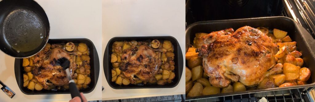 Na de benodigde tijd, namelijk ongeveer 30-40 minuten, en wanneer de bouillon tot ongeveer de helft van zijn oorspronkelijke volume is gereduceerd, zet het vuur uit. Gebruik twee lepels of een schuimspaan om de kip voorzichtig uit de braadpan te tillen en in een ovenschaal te leggen. Zorg ervoor dat je ook de gekookte knoflookteentjes in de ovenschaal plaatst, omdat ze tijdens het bakken extra smaak zullen geven. Verdeel rondom de kip alle aardappelen die je eerder hebt gesneden en gemarineerd, zodat ze gelijkmatig verdeeld zijn. Zet alles in de voorverwarmde oven op 180°C (conventioneel of hetelucht) en bak nog 30-40 minuten, of totdat de kip mooi goudbruin is en de aardappelen zacht en licht krokant zijn.