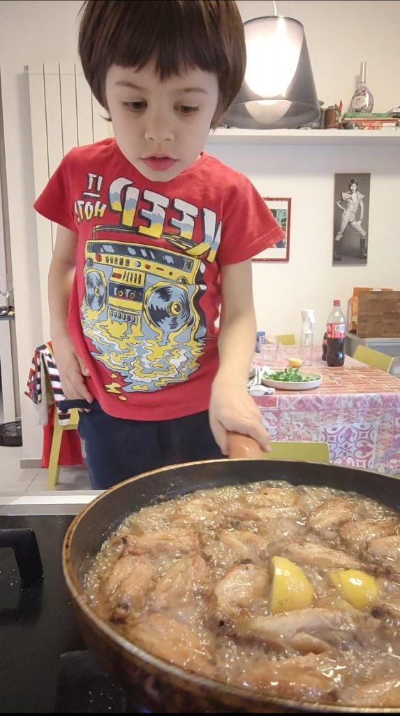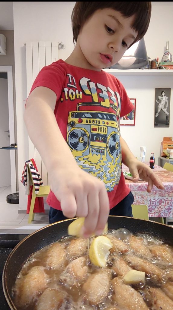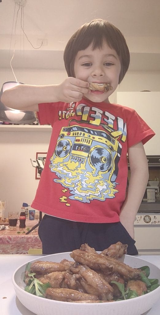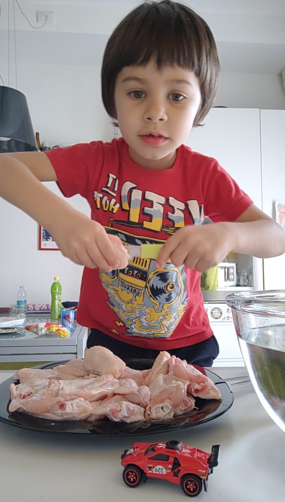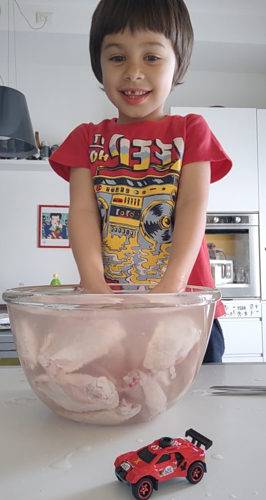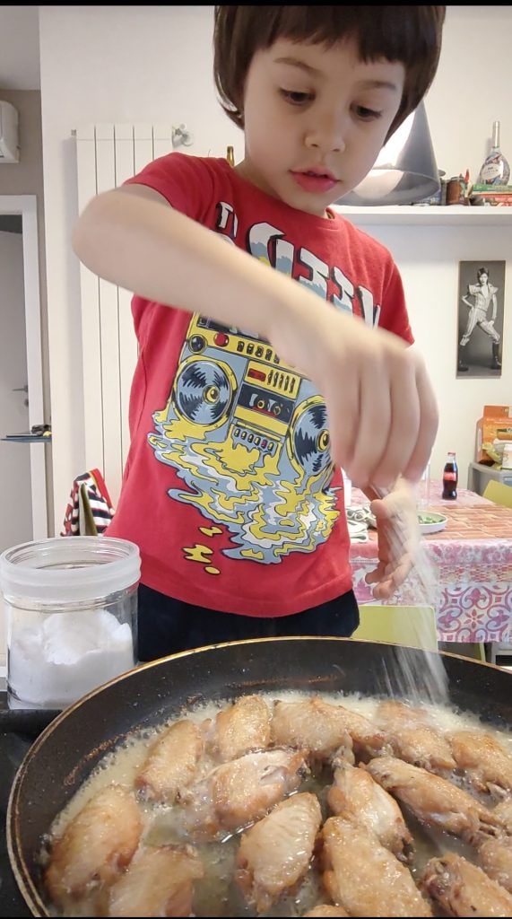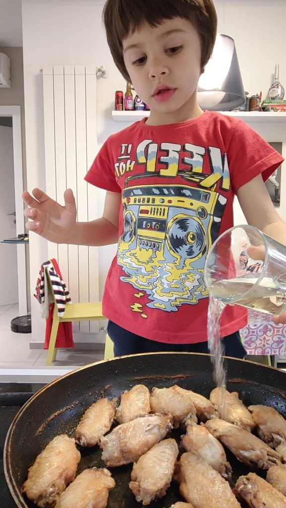 Nadat ik ze mooi in de pan heb gelegd, heb ik ook een teentje knoflook toegevoegd zodat, wanneer deze goudbruin aan de zijkant van de pan is, ook de vleugeltjes goudbruin zijn zonder ze te hoeven bewegen.