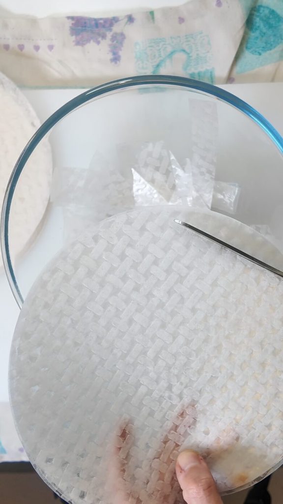 Terwijl de saus kookt, bereid je de noedels met de rijstpapierschijven.