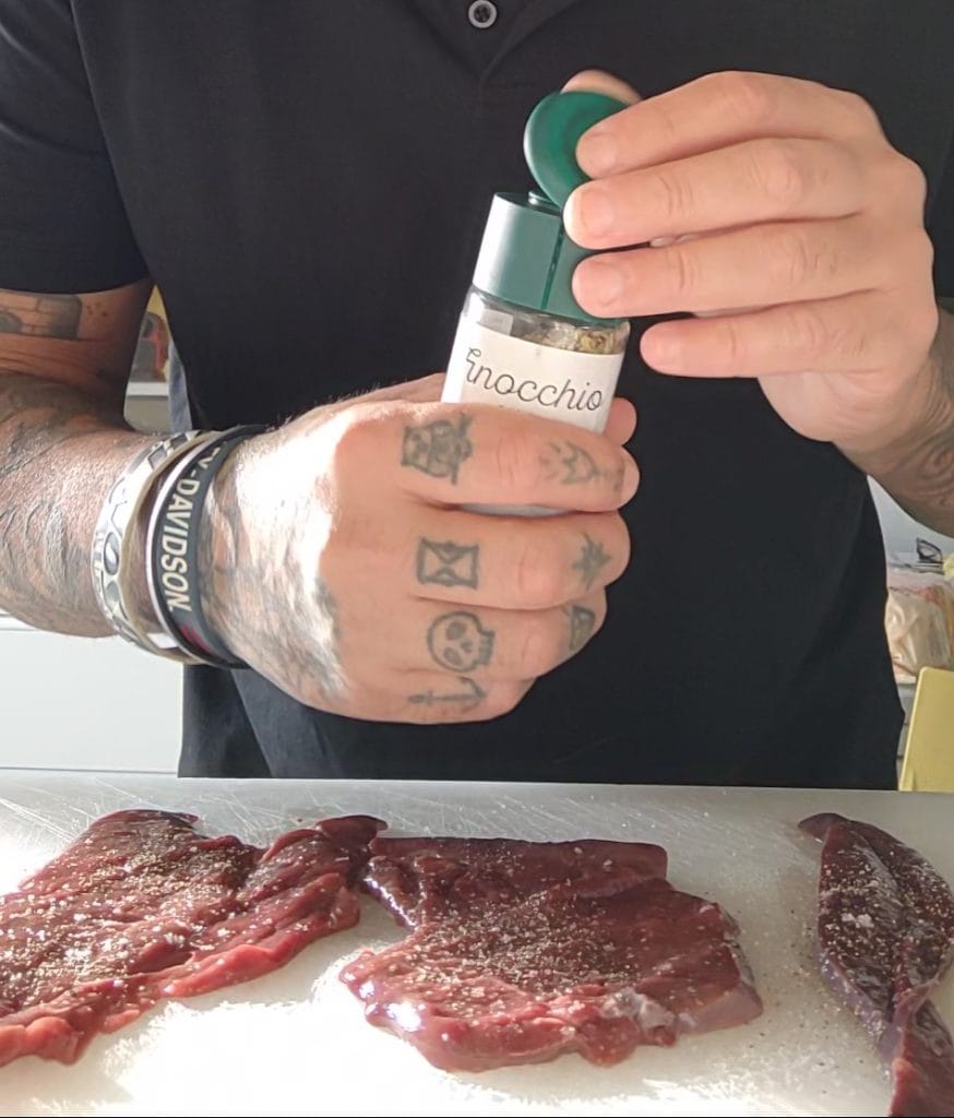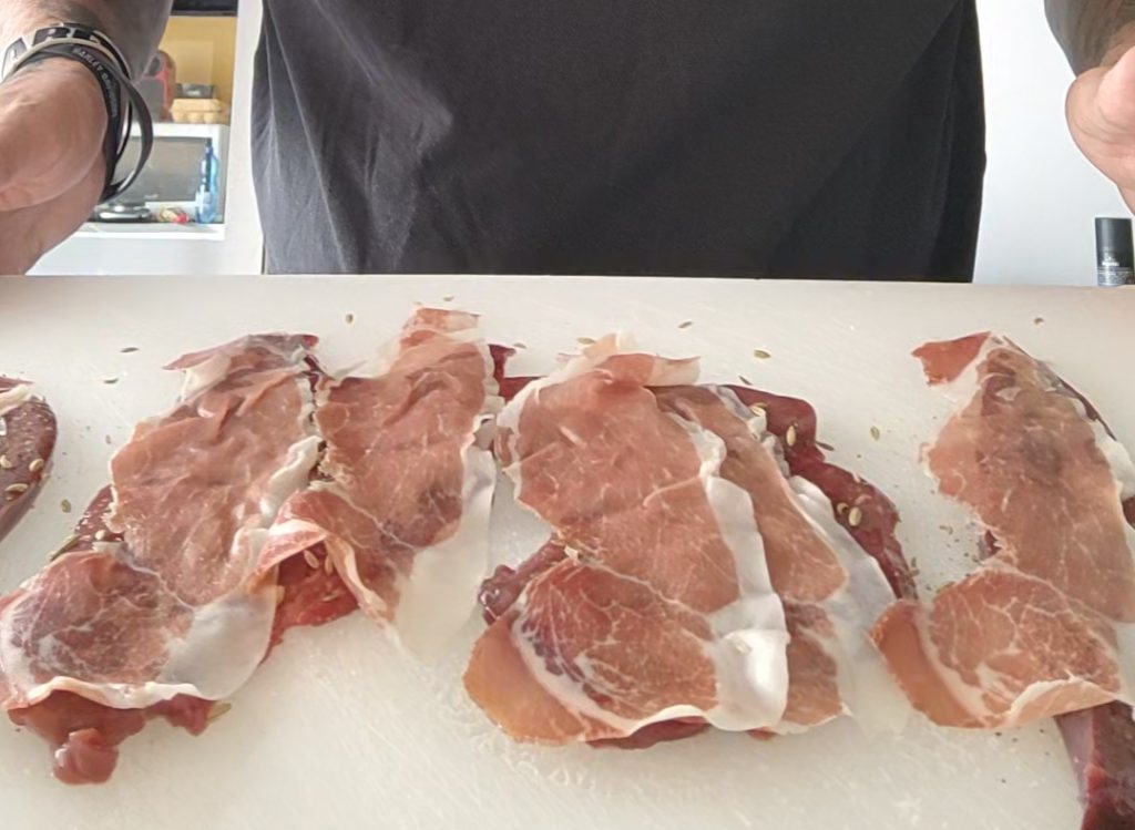 • Vervolgens leggen we op elke plak lever waar we al zout, peper en venkelzaadjes op hebben gedaan, ook een of twee plakjes rauwe ham.