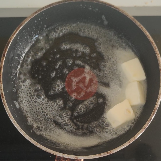 • In een antiaanbakpan heb ik de boter laten smelten en zonder iets anders toe te voegen, zet ik de lever op de Lodigiana wijze in de pan.