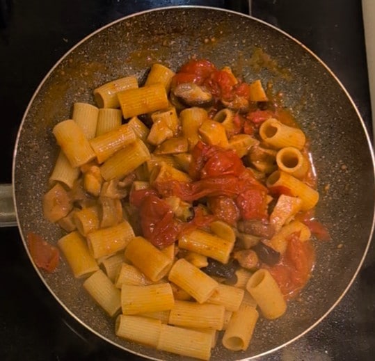 Nu kunnen we ook de paddenstoelhoed toevoegen die we aan het begin hadden gesneden en apart hadden gezet. Ga door met koken voor nog eens 10 minuten, voeg indien nodig wat pasta-kookwater toe.