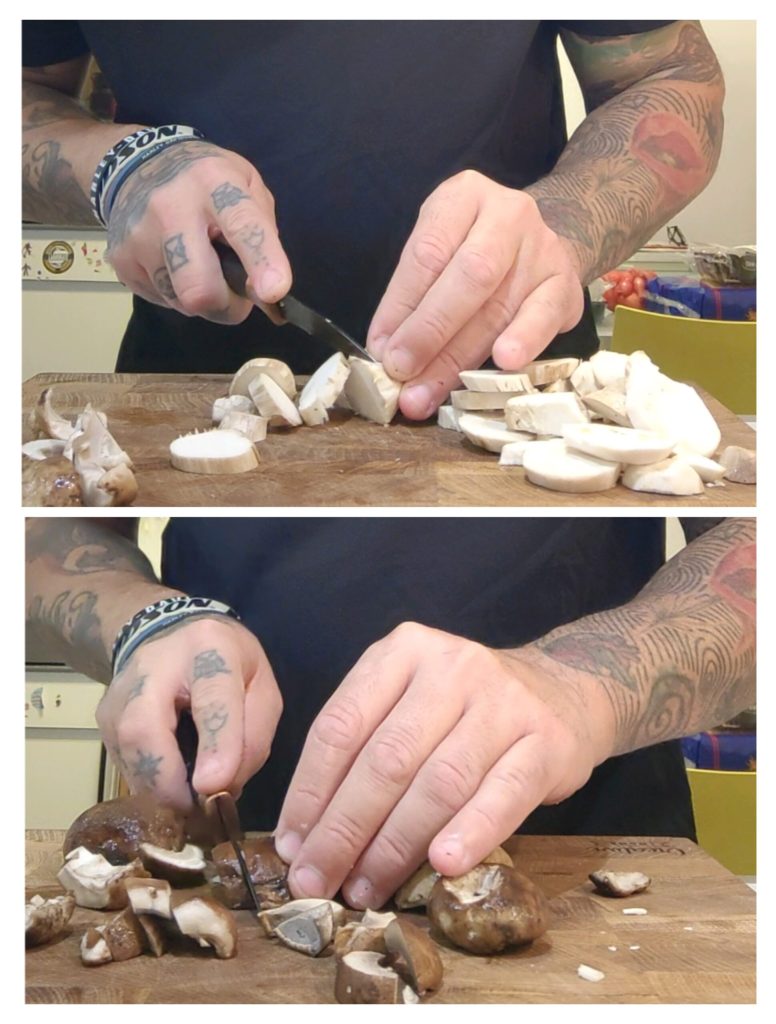 • Vervolgens verwijder ik het peterseliesteeltje en voeg ik alleen het hardere deel van de paddenstoelen toe, namelijk de steeltjes omdat deze een paar minuten meer kooktijd nodig hebben dan de hoed van de paddenstoel.