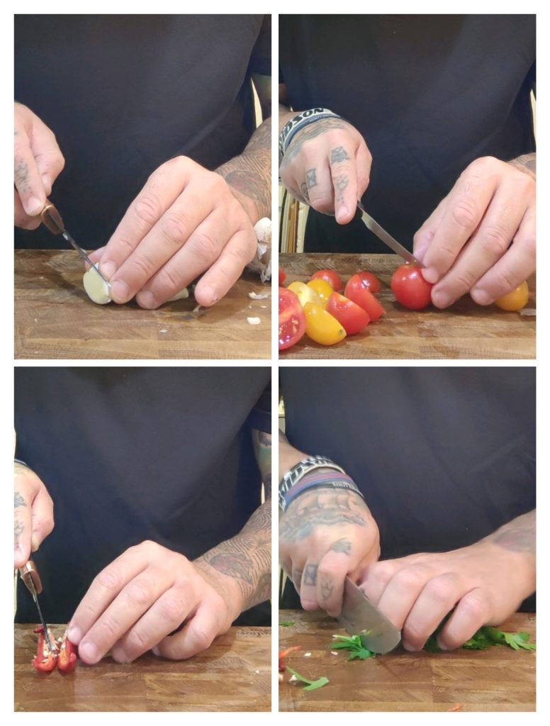 • Dan snijden we de cherrytomaten doormidden, de knoflook kun je heel en geplet laten of je kunt hem doormidden snijden zoals ik heb gedaan en ten slotte, nadat je de zaden van de pittige chilipeper hebt verwijderd, hakken we ook de peterselie die we zullen gebruiken tijdens de bereiding van de pasta met eekhoorntjesbrood.
