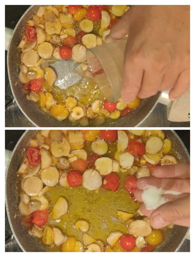 • Ondertussen voegen we ook de witte wijn toe om te blussen en zodra het alcoholische deel is verdampt, kunnen we al het zout toevoegen.