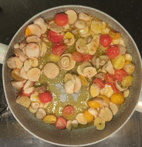 • We beginnen met het maken van de soffritto met peterseliesteeltje, knoflook, pittige chilipeper, de doormidden gesneden cherrytomaten totdat deze laatste net iets geroosterd aan de oppervlakte zijn en pas op dat de knoflook niet verbrandt.