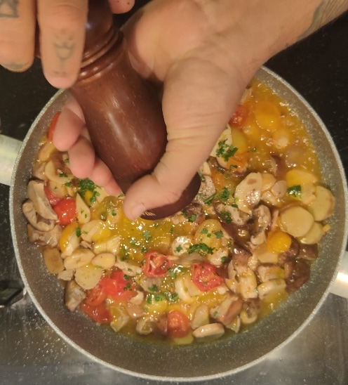 • Samenvattend, na het bereiden van de saus met de cherrytomaten, laten we de stelen van de paddenstoelen een paar minuten langer koken dan de hoed die we samen met de zwarte peper en een paar blaadjes gehakte peterselie een minuut voor het afgieten van de pasta toevoegen aan de saus.