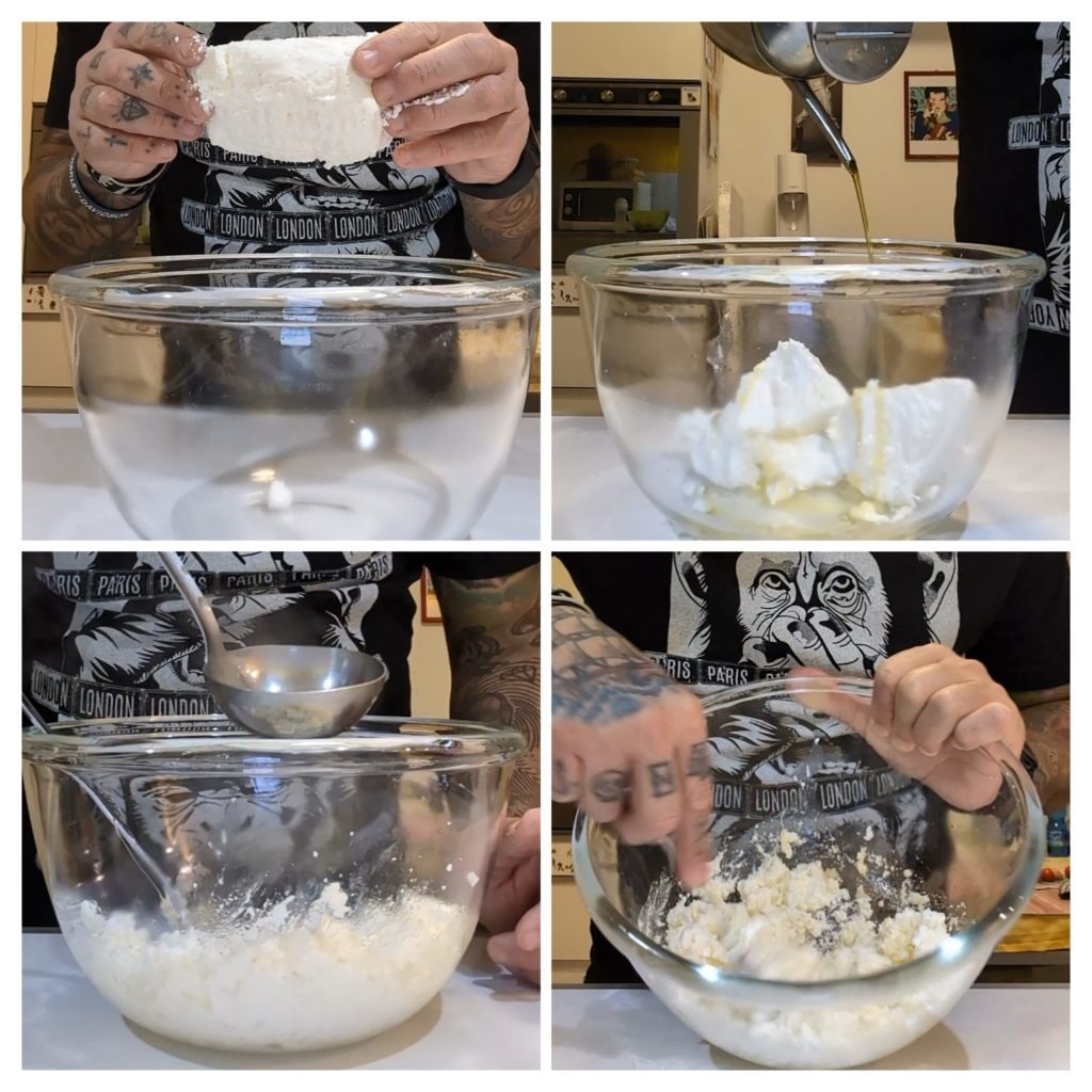 Vervolgens beginnen we de ricotta te kruiden met extra vergine olijfolie en kookwater van de pasta, terwijl we roeren tot we een heerlijke crème krijgen die als saus gebruikt wordt voor de spaghettoni.