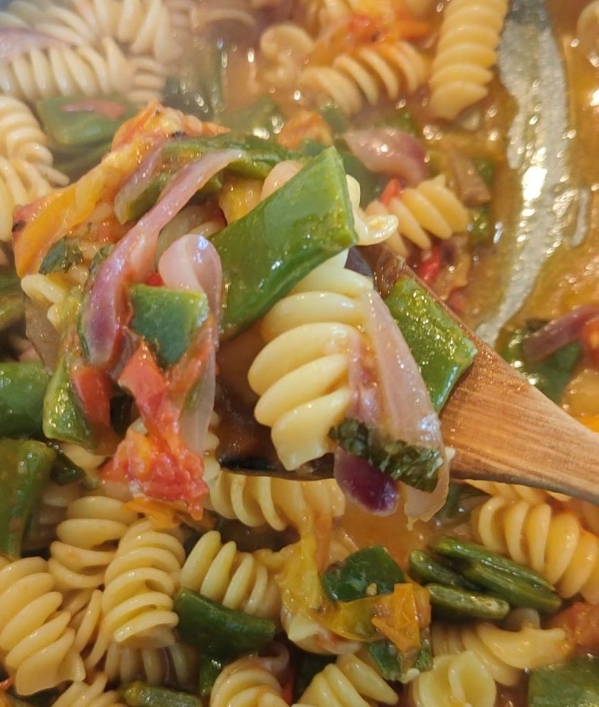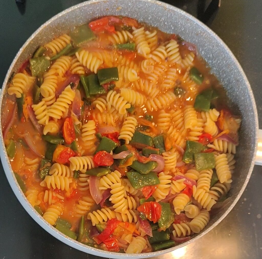 • Zodra de suikererwten klaar zijn, voeg ik ze direct in de pan toe met de saus en laat alles sudderen om de smaken te laten intrekken terwijl we de pasta koken in hetzelfde water als waarin we de suikererwten hebben gekookt.