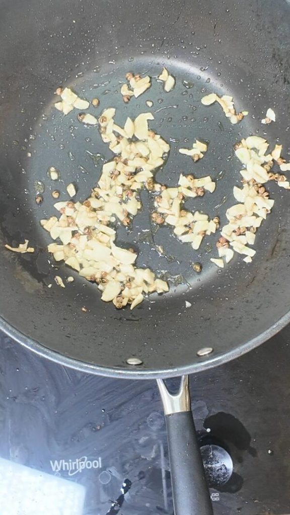 Op middelhoog vuur, voeg Sichuanpeperkorrels en gehakte knoflook toe.
