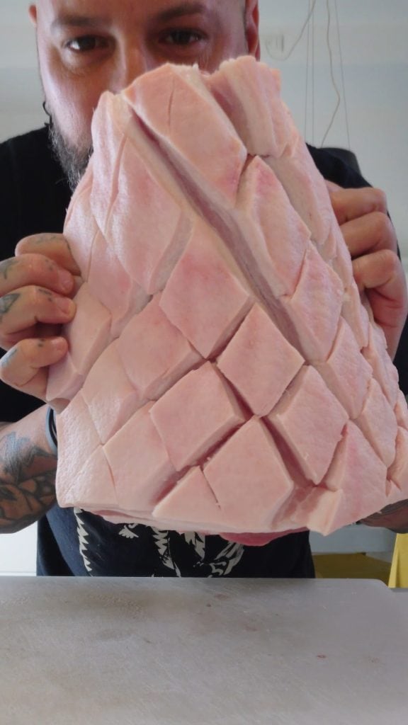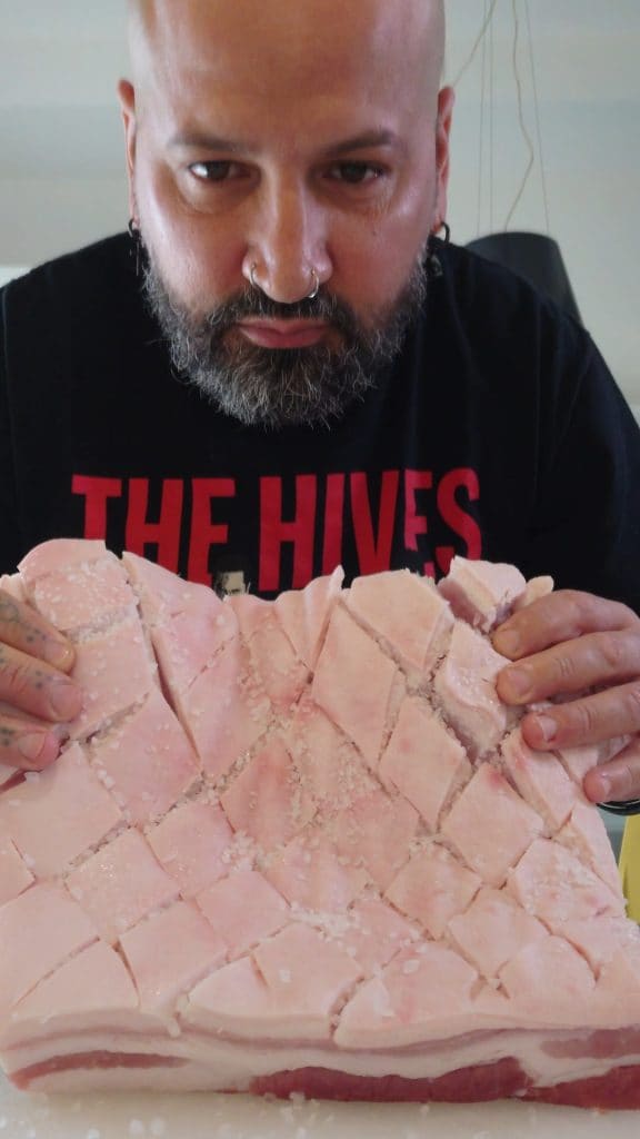 Begin met het insnijden van het krokante zwoerd, dan in het malse vlees.