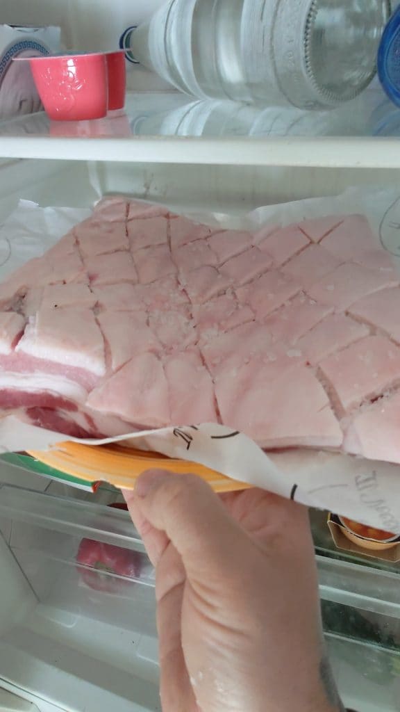 Bestrooi vervolgens het ingesneden zwoerd royaal met grof zout. Masseer het lichtjes om het in te laten dringen. Nu, de cruciale stap: plaats de bacon onafgedekt in de koelkast, met het zwoerd naar boven, voor minstens 8-12 uur.