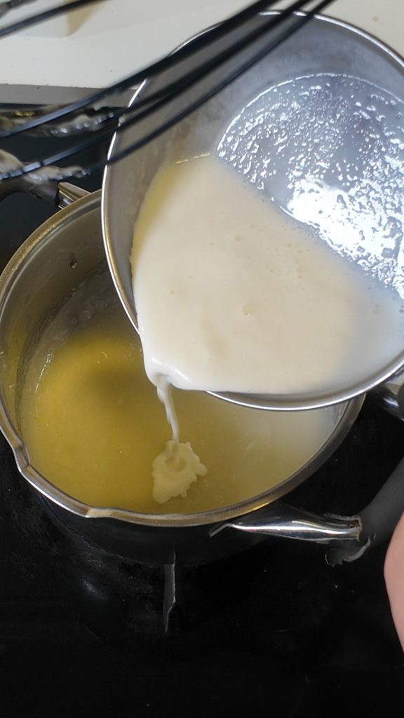 Als het gebeurt, zet de pan terug op zeer laag vuur en roer totdat de klonten oplossen en het mengsel weer glad wordt.