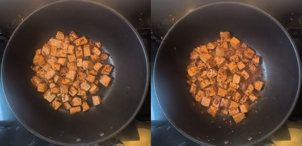 Grill de tofu ongeveer 2-3 minuten per kant, of totdat ze goudbruin en licht krokant zijn.