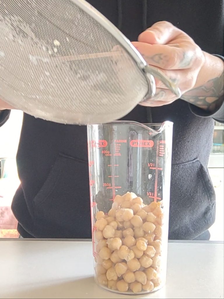 Om te beginnen, heb ik de kikkererwten grondig afgespoeld onder koud stromend water om de conserveringsvloeistof volledig te verwijderen. Deze stap is belangrijk om de metaalachtige smaak van de kikkererwten te verwijderen en een romige hummusconsistentie te bereiken.
