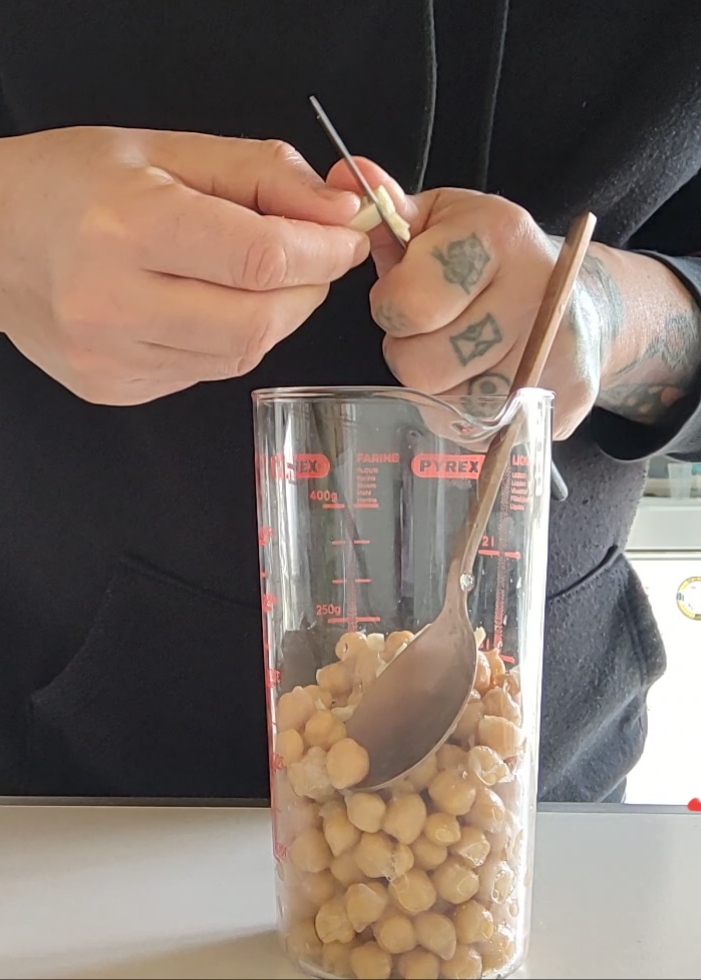 Ik heb ook een teentje knoflook toegevoegd, doormidden gesneden en de kiem verwijderd om te voorkomen dat het te sterk smaakt. De kern van de knoflook is namelijk het meest smaakvolle gedeelte en kan een te intense smaak aan de hummus geven.