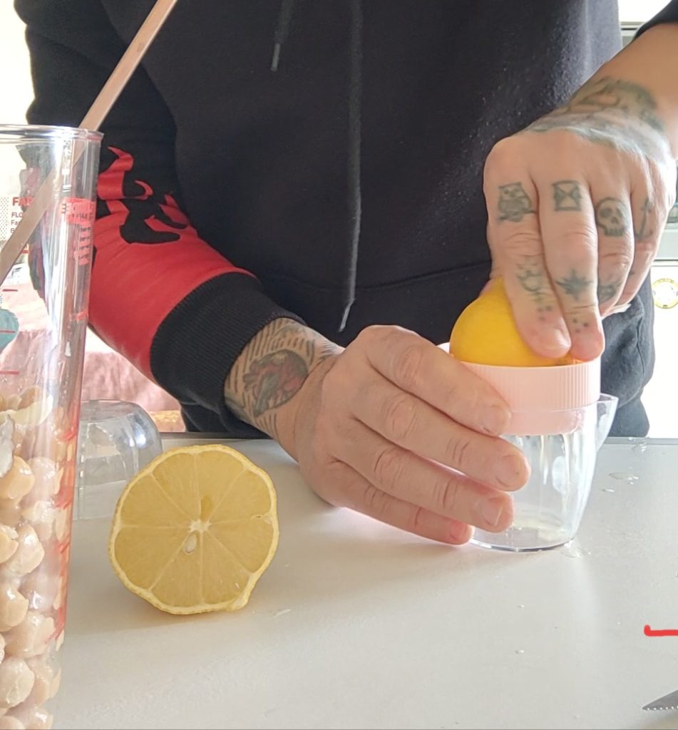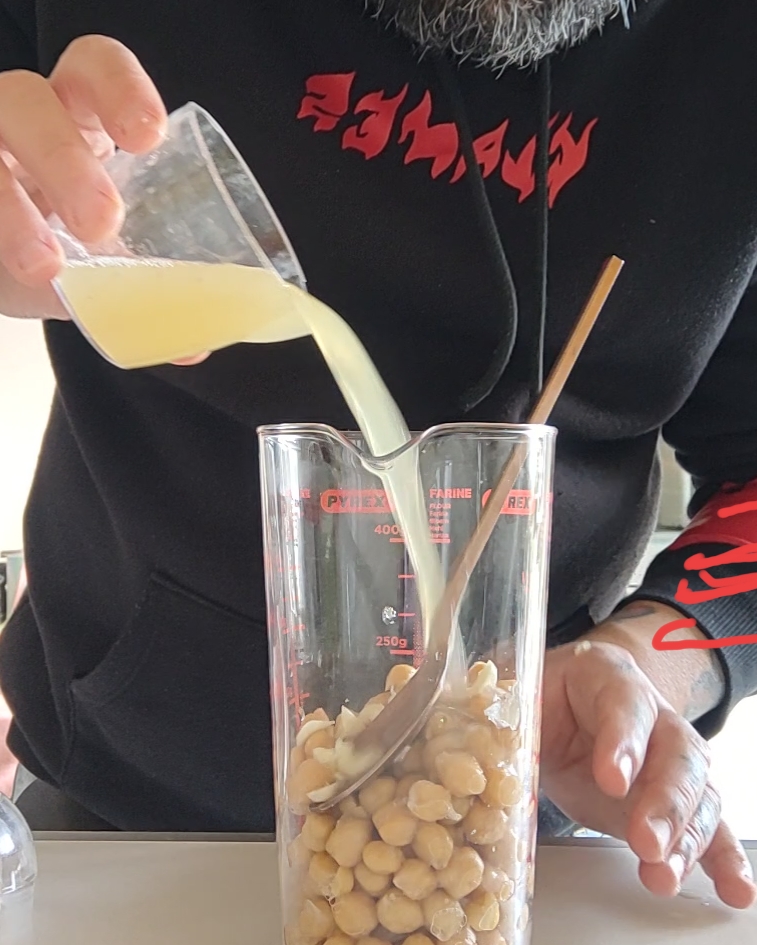 Nadat ik de citroen had uitgeperst, heb ik het verse sap in de kan van de staafmixer gegoten. Op dit punt heb ik ook de afgespoelde en uitgelekte kikkererwten, de knoflook zonder kiem, tahini, gerookte paprika en een snufje zout toegevoegd. Alle ingrediënten samenvoegen is belangrijk om een homogene en romige hummus te verkrijgen.