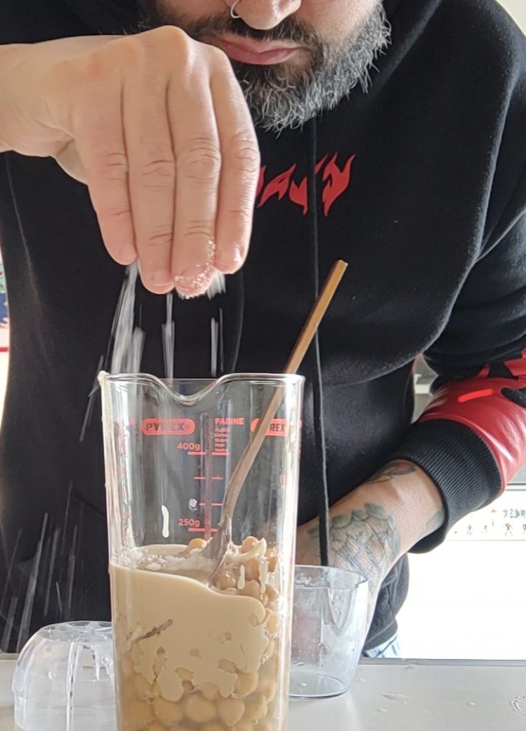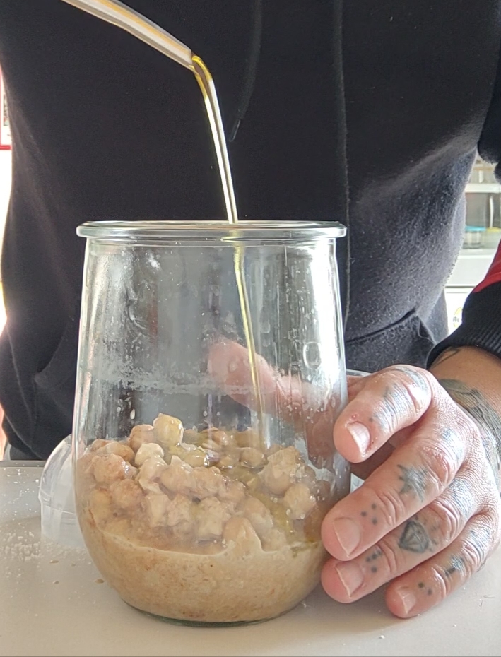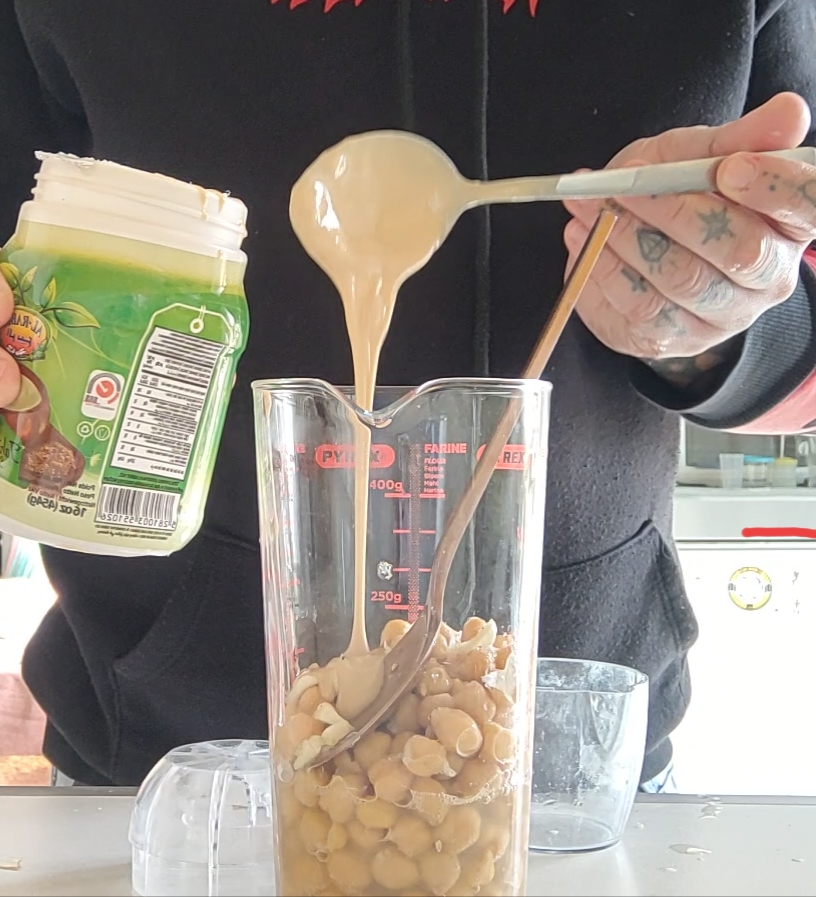 Nu is het tijd om de tahini toe te voegen, het ingrediënt dat alle ingrediënten zal binden en onze hummus zijn kenmerkende romigheid en consistentie zal geven.