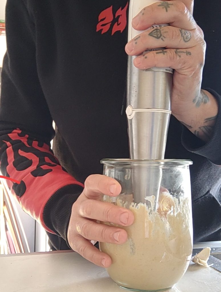 Het is tijd om te mixen! Zet je mixer aan en stop niet totdat je een homogene en fluweelzachte hummus hebt.