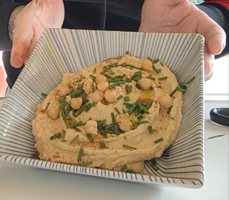 Je kikkererwtenhummus is klaar om geserveerd en gedeeld te worden met vrienden en familie. Een gelegenheid om samen te zijn en te genieten van een eenvoudig en heerlijk gerecht.