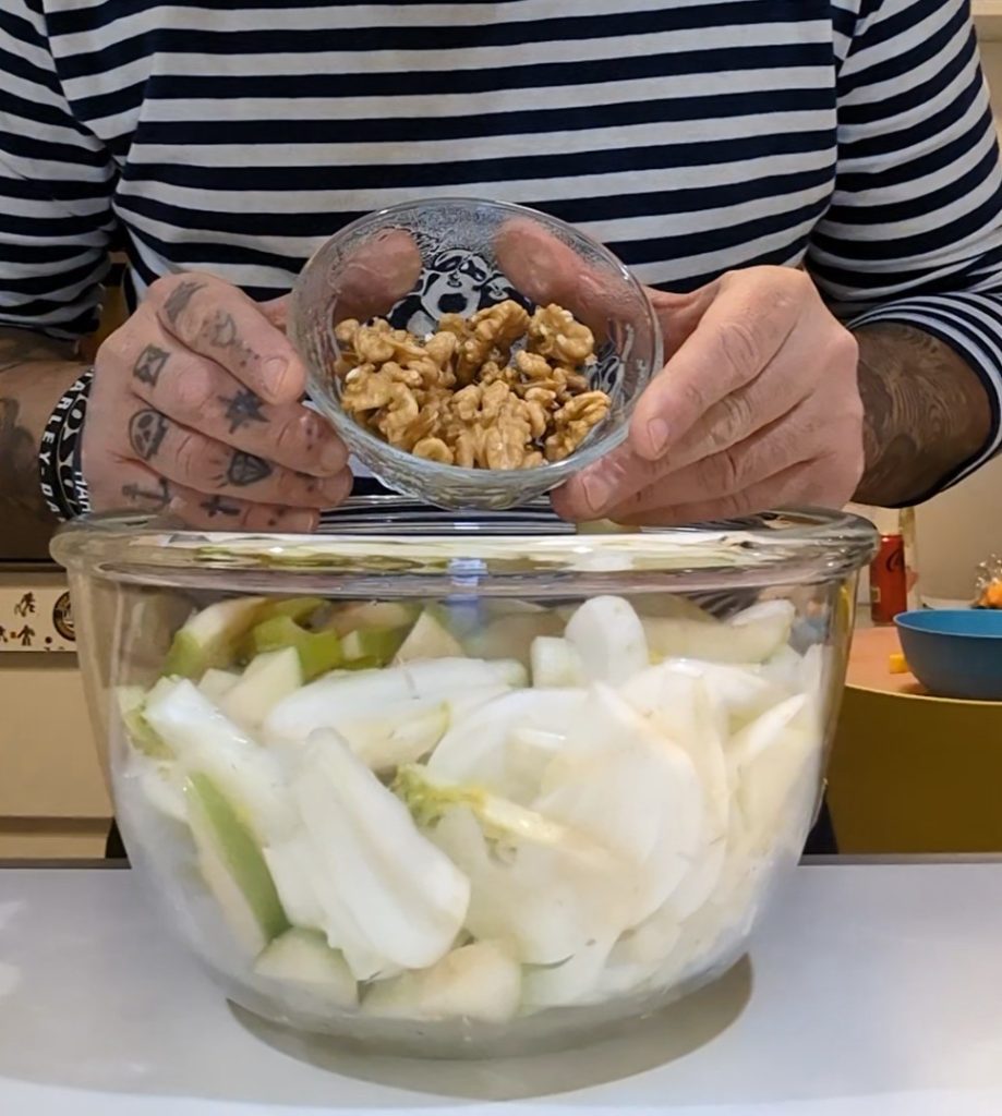 Vervolgens, leg de plakjes venkel en appel in de kom. Voeg de walnoten toe voor een knapperige en voedzame bite. Deze combinatie van ingrediënten zal bijdragen aan het creëren van een uitgebalanceerde en smakelijke salade.
