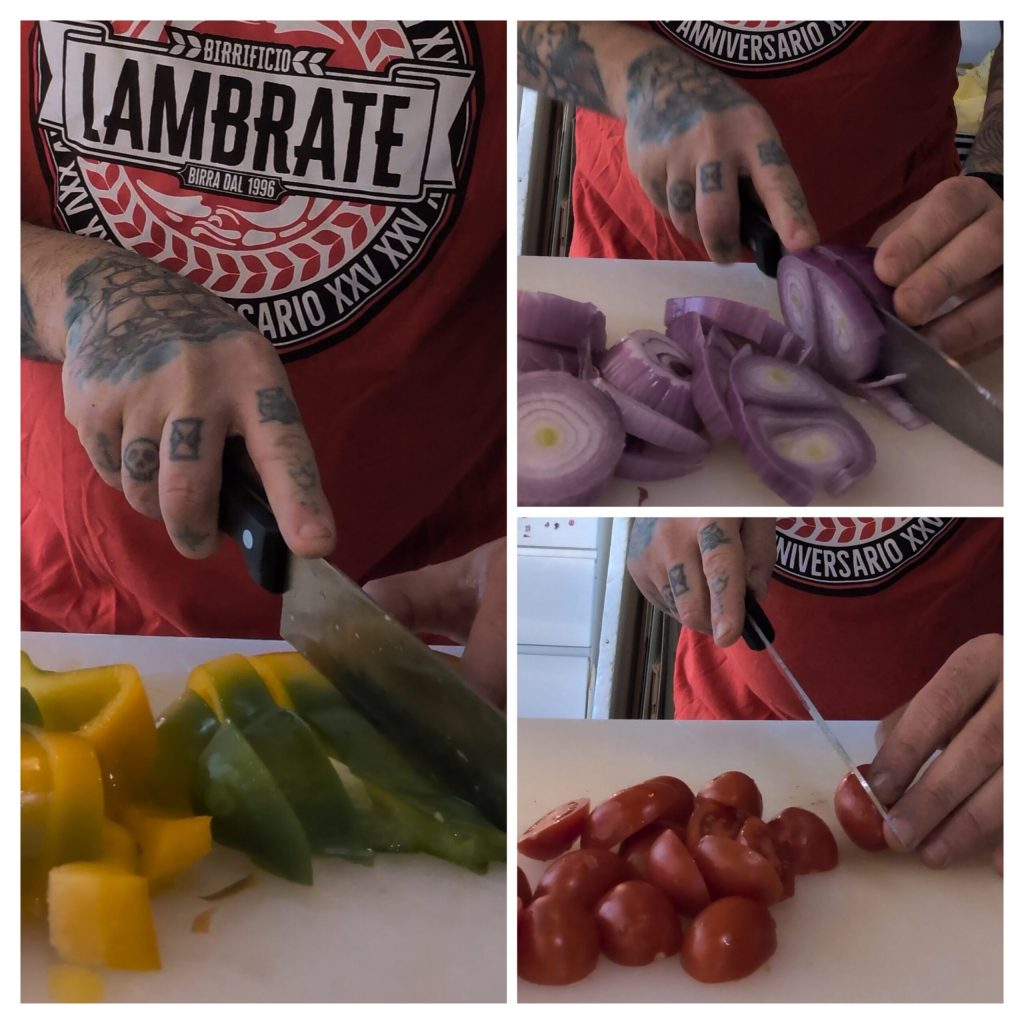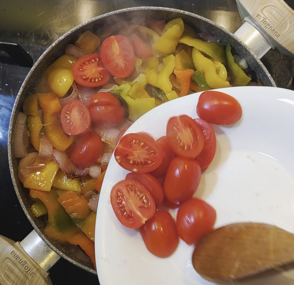 • Om worst, paprika en champignons in de pan te bereiden, begon ik met het schoonmaken en snijden van de tomaten in plakjes van 1 cm breed. Vervolgens sneed ik de ui in ringen en de tomaatjes doormidden. Als de tomaatjes wat groter zijn, kun je ze in kwarten snijden in plaats van doormidden.