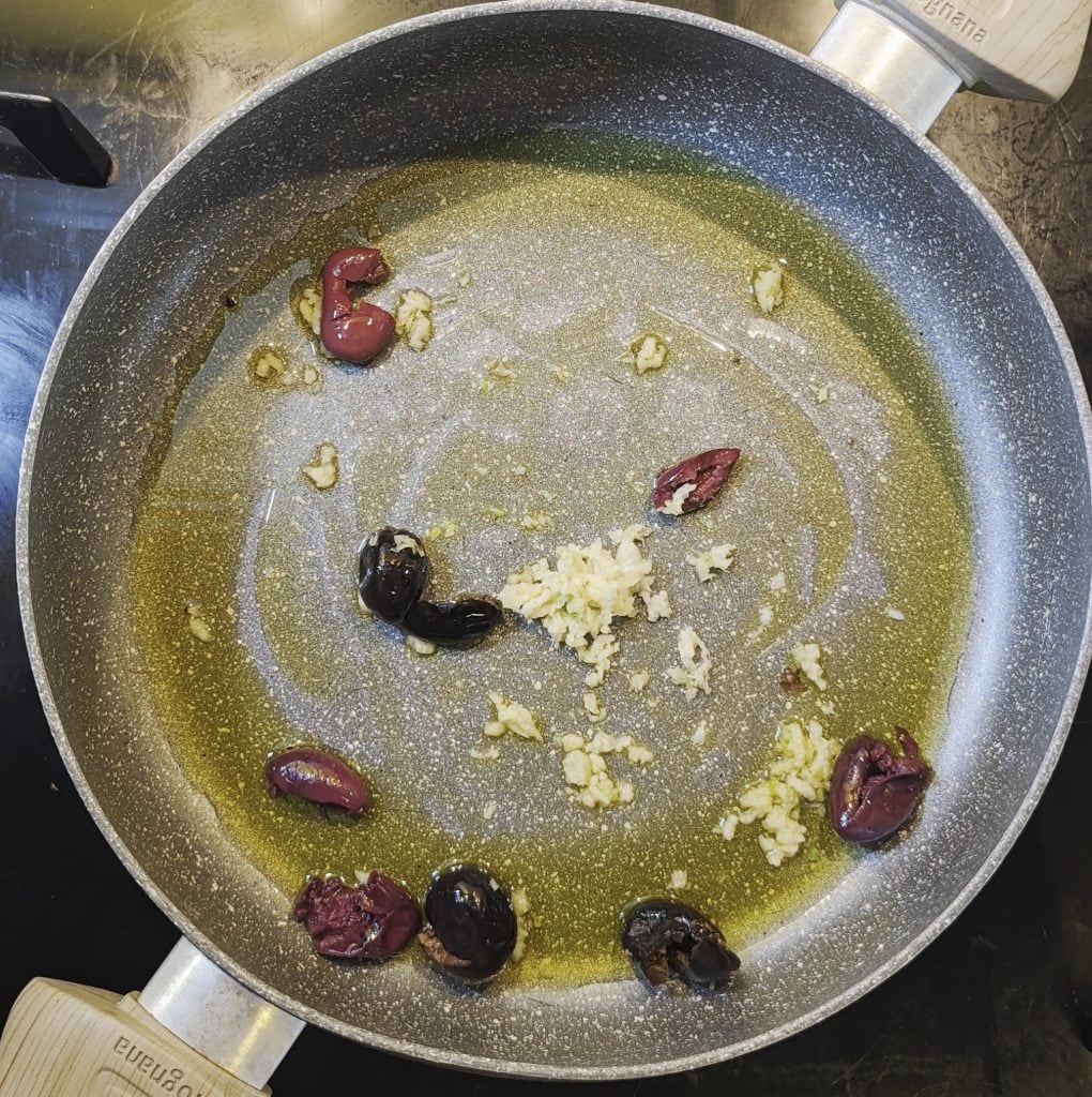 • Ik bakte de knoflook, vooraf geplet met een knoflookpers, in overvloedige extra vergine olijfolie. Om de olie op smaak te brengen, voegde ik ook enkele geplette olijven zonder pit toe.