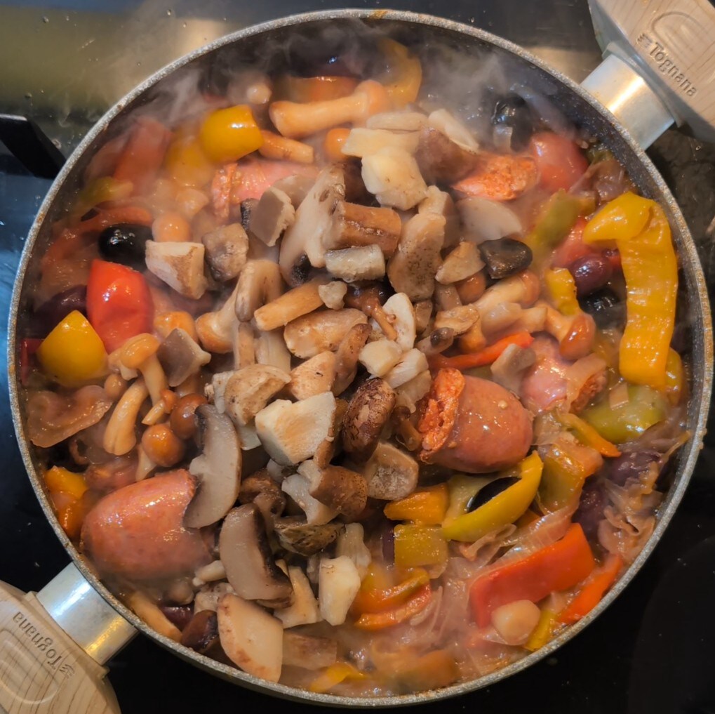 Worst, paprika en champignons in de pan: knapperig en smaakvol