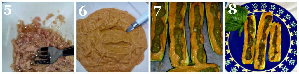 De courgettes, mooi stevig en net geblancheerd, werden kleine schatkistjes gevuld met een geurige en smakelijke vulling. De tonijn geeft een hartige smaak, de pesto een onweerstaanbare aromatische toets.