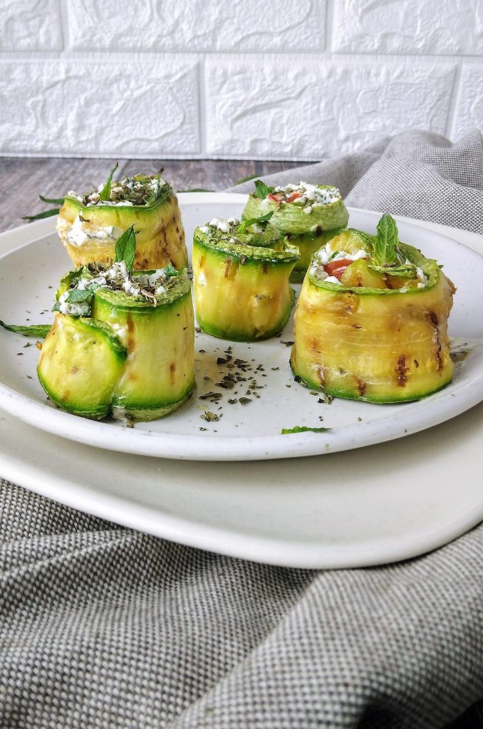 Je kunt de gegrilde courgetterolletjes ook koud serveren, zonder ze in de oven te doen.