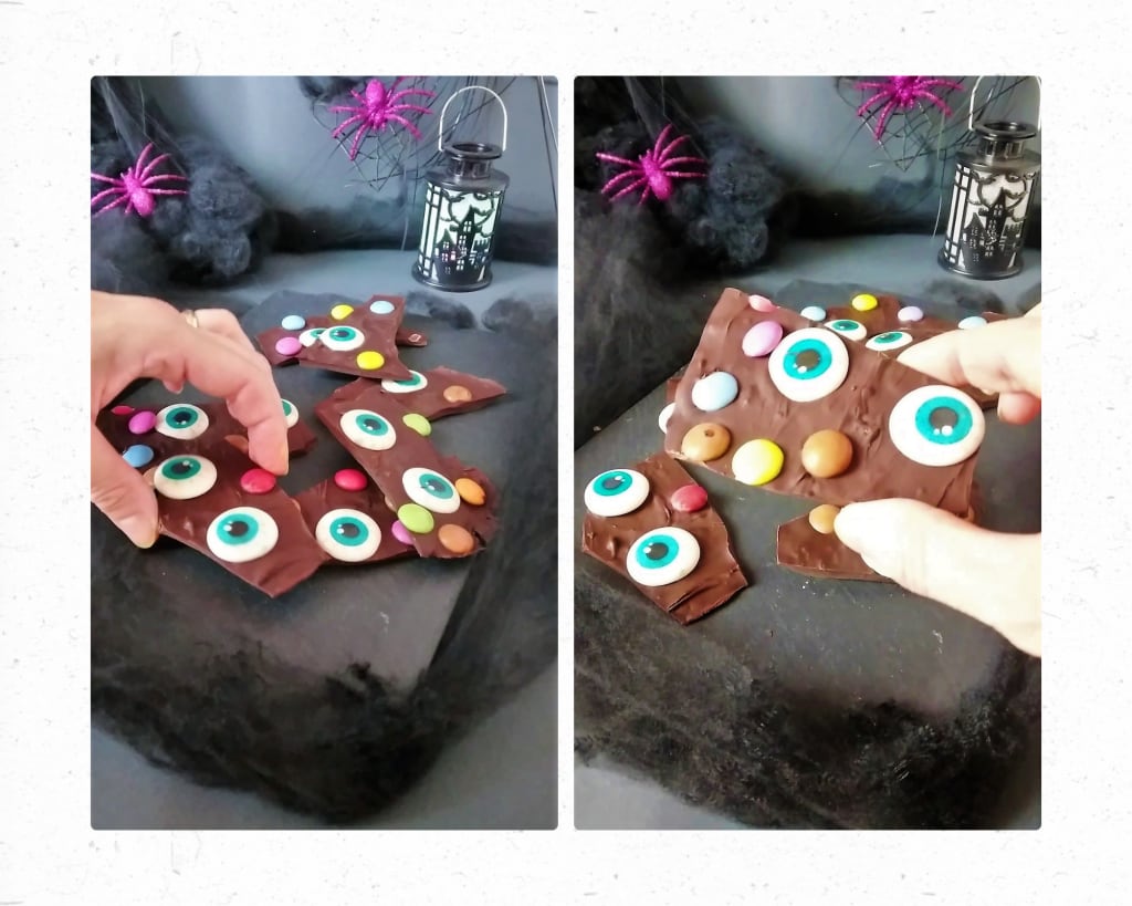 Je hoeft alleen maar wat chocolade (jouw favoriete smaak) te smelten, het in een rechthoekige vorm te gieten (maar niet te precies!) en decoraties toe te voegen die aan Halloween doen denken. Ik koos voor monsterlijke ogen en gekleurde chocolade snoepjes.