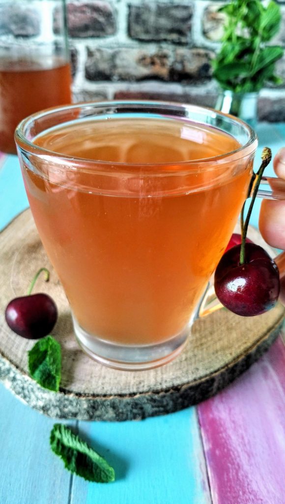 Je hebt hoogwaardig groene thee in zakjes nodig, een handvol ontpitte kersen en verse muntblaadjes; doe alles in een karaf met koud water en laat het in de koelkast trekken; filter de vloeistof en voeg citroensap toe voor een vleugje zuurheid, dat perfect de zoetheid van de kersen in balans brengt; zoet naar smaak met honing, agavesiroop of suiker, volgens jouw voorkeur.