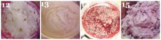 Meng intussen de bosvruchten met een eetlepel suiker en verwarm ze in een koekenpan om hun sap in te dikken (14). Na een half uur voeg je de bosvruchten toe aan de room en bewaar je ze opnieuw in de koelkast (15).