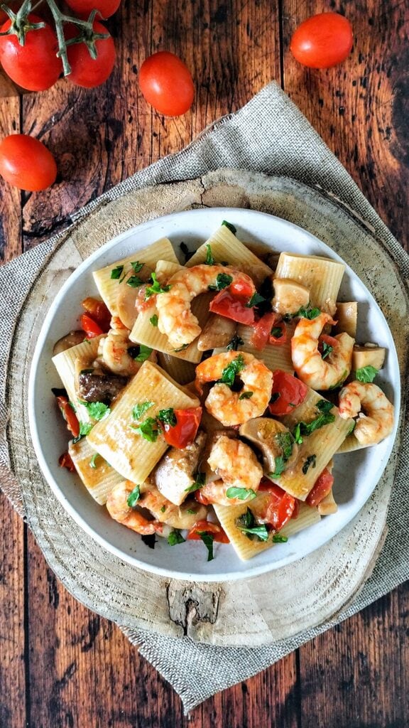 Paccheri met garnalen en eekhoorntjesbrood: een onweerstaanbare ontmoeting tussen zee en bos