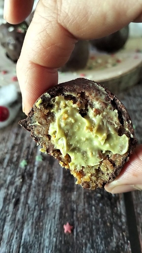 Giet het mengsel in een kom en voeg de gesmolten chocolade en rum toe. Meng het geheel goed, neem een eetlepel van het deeg en druk het in één hand, vormend een holte. Plaats dan een theelepel pistachecrème in het midden en sluit af door er een balletje van te maken.