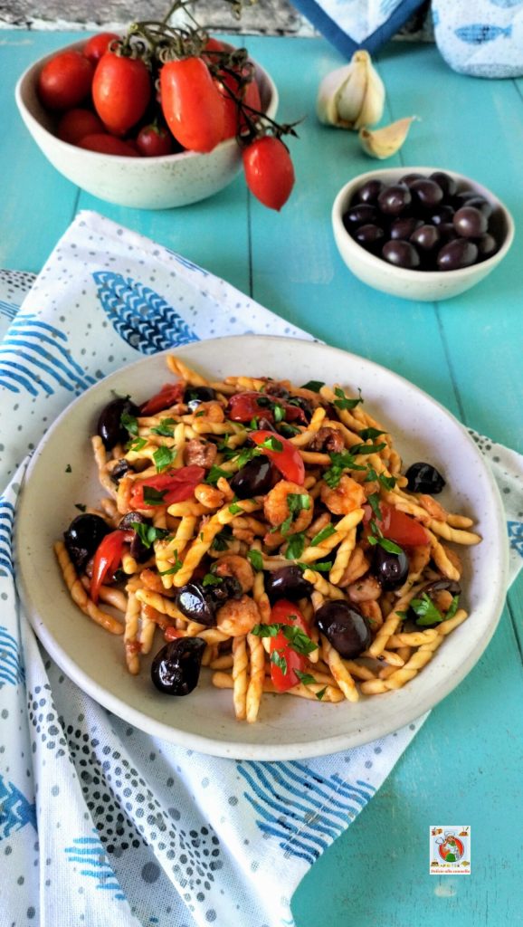 De keuze van de pasta is cruciaal om de saus optimaal tot zijn recht te laten komen. Trofie of cortecce zijn perfect om de saus en stukjes garnalen en olijven op te vangen; maar ook penne, fusilli of lange vormen zoals spaghetti of linguine kunnen een even heerlijke ervaring bieden. De pasta wordt al dente gekookt en vervolgens in de saus gebakken, waardoor de smaken perfect samengaan. Het gerecht wordt afgemaakt met een snufje verse peterselie en, voor wie dat wil, een scheutje rauwe extra vierge olijfolie.