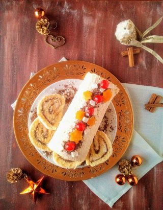 De rol met kastanjerom en witte chocolade is een heerlijke verleiding om je kerst nog spannender te maken.