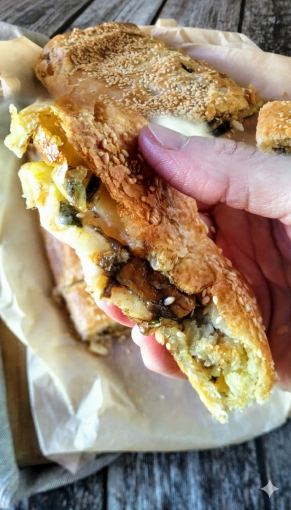 Bladerdeeg: een rol hoogwaardig bladerdeeg is de ideale basis, die een goudbruine en knapperige korst garandeert die de kern van de vulling omsluit. Een strooi sesamzaadjes bovenop voegt een knapperige toets toe en maakt het nog aantrekkelijker.