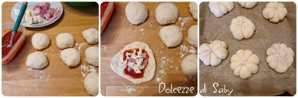 Begin dan met het bereiden van je pizzapompoenen door de balletjes uit te rollen, een theelepel puree, mozzarella en ham toe te voegen en het balletje goed dicht te maken. Wanneer je alle balletjes hebt gevuld, vorm dan de pompoenen met behulp van keukentouw. De eenvoudigste methode is om 4 stukken touw te snijden, ze over elkaar te kruisen, het balletje erop te leggen en altijd de twee uiteinden in het midden aan elkaar vast te maken. Maar je kunt ook met een enkel touw de pompoen meerdere keren omwikkelen totdat je de vorm hebt verkregen.